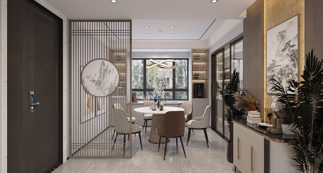 本案整體以現(xiàn)代中式風格為主,既有現(xiàn)代風格簡約、明朗的線條,又有中國傳統(tǒng)內(nèi)涵與韻味。墻面大面積使用暖色烘托整體氛圍,融洽中式與現(xiàn)代簡約兩種風格??臻g更寬闊舒適玄關收納、玄關與干區(qū)相結合,既解放的外衛(wèi)的空間客廳電視背景是一面裝飾柜,豐富了空間,增加了收納和儲物,美觀又實用。