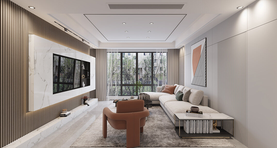 本案設計風格為意式輕奢,拒絕了濃烈的色彩,以一種簡單、純粹的設計語言,回歸生活的本質,留存給居住者更多生活想象的空間。 整體空間灰橙色、駝色、與淺暖灰色調展現(xiàn)輕奢低調的高級質感,簡約時尚的家具又增添了一份現(xiàn)代感,重新梳理了空間功能和尺寸,客廳陽臺一體化設計,最大限度引入自然光,高級灰搭配中性色系木飾面,打造一個舒適的高品質空間。在空間設計與色彩配搭上,精準地把控節(jié)奏,用設計表達空間的包容性,更多的是通過人性化思考,創(chuàng)造一個功能性完整的舒適生活空間。大塊的木飾面、金屬元素和燈 光的碰撞搭配,凸顯出強大張力,共同打造出意式輕奢腔調十足的時尚與質感。