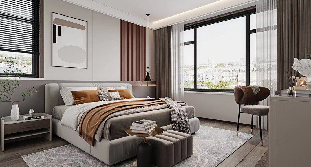 本案設(shè)計風(fēng)格為意式輕奢,拒絕了濃烈的色彩,以一種簡單、純粹的設(shè)計語言,回歸生活的本質(zhì),留存給居住者更多生活想象的空間。 整體空間灰橙色、駝色、與淺暖灰色調(diào)展現(xiàn)輕奢低調(diào)的高級質(zhì)感,簡約時尚的家具又增添了一份現(xiàn)代感,重新梳理了空間功能和尺寸,客廳陽臺一體化設(shè)計,最大限度引入自然光,高級灰搭配中性色系木飾面,打造一個舒適的高品質(zhì)空間。在空間設(shè)計與色彩配搭上,精準(zhǔn)地把控節(jié)奏,用設(shè)計表達(dá)空間的包容性,更多的是通過人性化思考,創(chuàng)造一個功能性完整的舒適生活空間。大塊的木飾面、金屬元素和燈 光的碰撞搭配,凸顯出強大張力,共同打造出意式輕奢腔調(diào)十足的時尚與質(zhì)感。