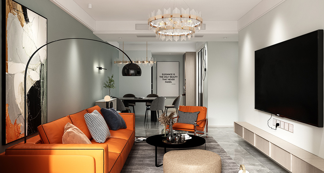 本案設(shè)計風(fēng)格為意式輕奢,拒絕了濃烈的色彩,以一種簡單、純粹的設(shè)計語言,回歸生活的本質(zhì),留存給居住者更多生活想象的空間。 整體空間灰橙色、駝色、與淺暖灰色調(diào)展現(xiàn)輕奢低調(diào)的高級質(zhì)感,簡約時尚的家具又增添了一份現(xiàn)代感,重新梳理了空間功能和尺寸,客廳陽臺一體化設(shè)計,最大限度引入自然光,高級灰搭配中性色系木飾面,打造一個舒適的高品質(zhì)空間。在空間設(shè)計與色彩配搭上,精準(zhǔn)地把控節(jié)奏,用設(shè)計表達(dá)空間的包容性,更多的是通過人性化思考,創(chuàng)造一個功能性完整的舒適生活空間。大塊的木飾面、金屬元素和燈 光的碰撞搭配,凸顯出強(qiáng)大張力,共同打造出意式輕奢腔調(diào)十足的時尚與質(zhì)感。