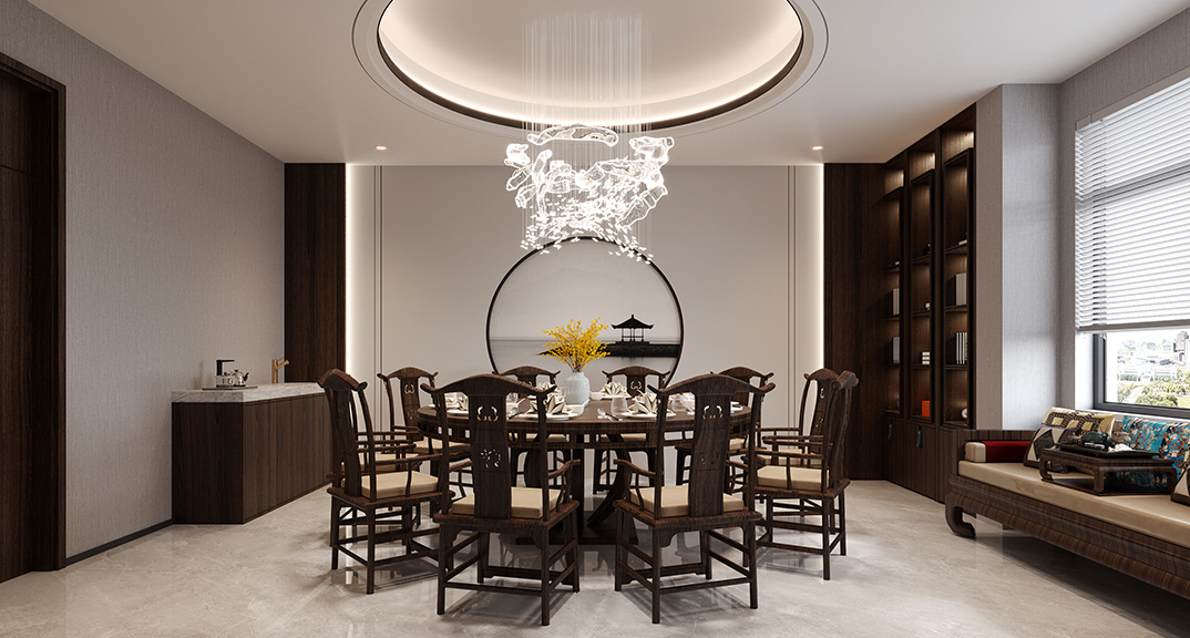 河山別墅300㎡別墅客餐廳新中式風(fēng)格裝修案例效果圖