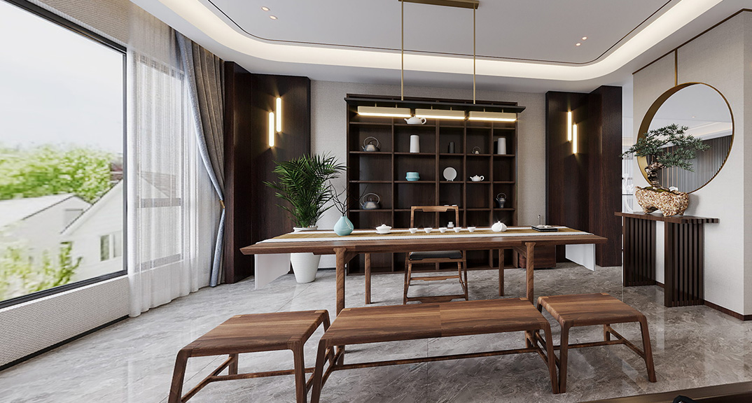 河山別墅300㎡別墅茶室新中式風(fēng)格裝修案例效果圖