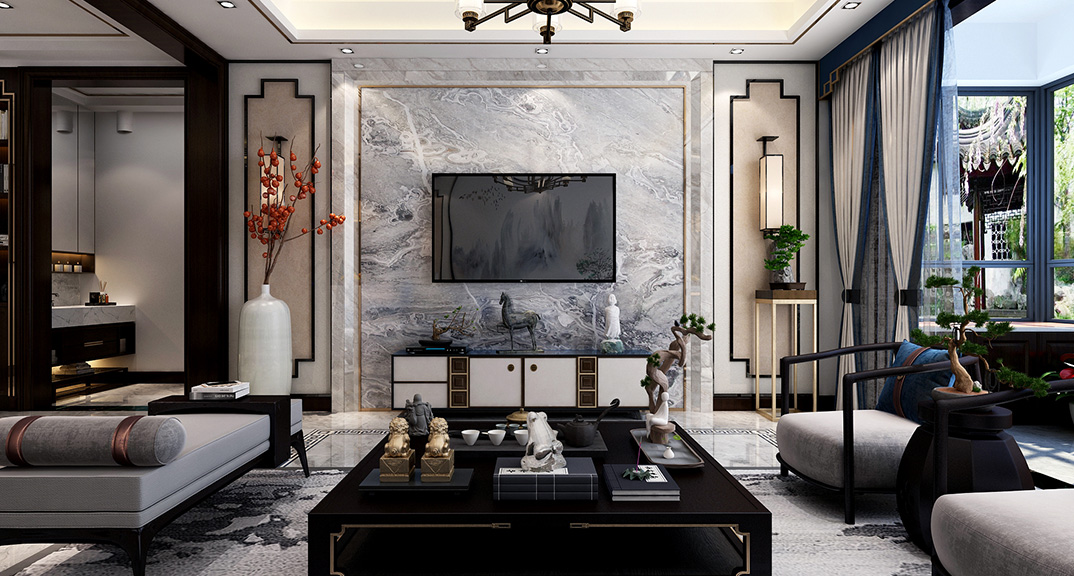 安泰名筑190㎡四室兩廳客廳電視新中式風格裝修案例效果圖-詳細.jpg