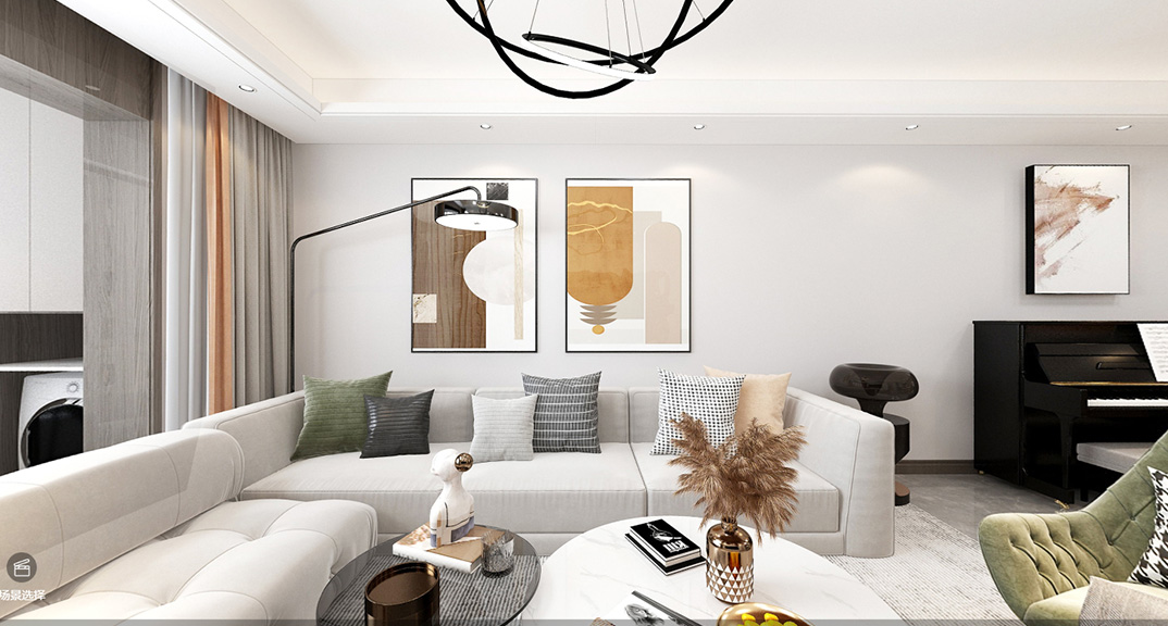 以現(xiàn)代風(fēng)格為主調(diào),主要色彩是米色、淺咖色、白色。在總體布局方面滿足寬敞明亮的需求,注重居室空間的布局與使用功能的完美結(jié)合。整體簡約又不失設(shè)計感,開放式布局空間聯(lián)通,動線流暢??蛷d米灰色系的沙發(fā),造型簡約,搭配材質(zhì)柔軟的軟裝,使客廳充滿閑話自在的空間氛圍。