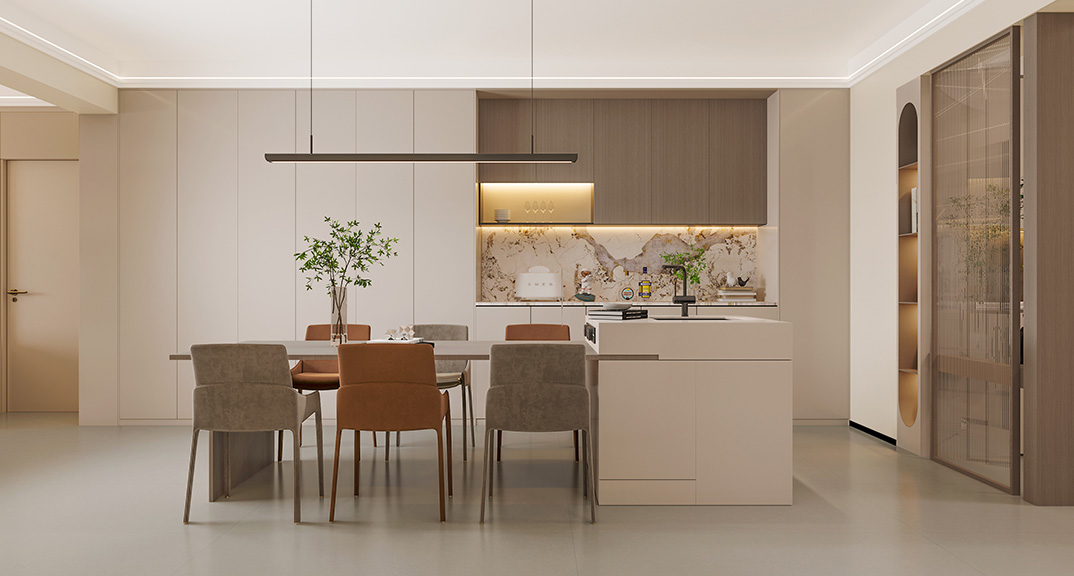 本案設(shè)計(jì)風(fēng)格為意式輕奢,拒絕了濃烈的色彩,以一種簡單、純粹的設(shè)計(jì)語言,回歸生活的本質(zhì),留存給居住者更多生活想象的空間。 整體空間灰橙色、駝色、與淺暖灰色調(diào)展現(xiàn)輕奢低調(diào)的高級質(zhì)感,簡約時(shí)尚的家具又增添了一份現(xiàn)代感,重新梳理了空間功能和尺寸,客廳陽臺(tái)一體化設(shè)計(jì),最大限度引入自然光,高級灰搭配中性色系木飾面,打造一個(gè)舒適的高品質(zhì)空間。在空間設(shè)計(jì)與色彩配搭上,精準(zhǔn)地把控節(jié)奏,用設(shè)計(jì)表達(dá)空間的包容性,更多的是通過人性化思考,創(chuàng)造一個(gè)功能性完整的舒適生活空間。大塊的木飾面、金屬元素和燈 光的碰撞搭配,凸顯出強(qiáng)大張力,共同打造出意式輕奢腔調(diào)十足的時(shí)尚與質(zhì)感。
