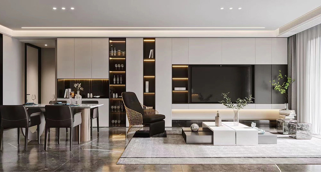 本案設(shè)計風(fēng)格為現(xiàn)代簡約風(fēng)格,首先從拾掇空間開始,充分解析原空間的優(yōu)缺點(diǎn),打散原有空間布局,重新組合構(gòu)建,盡可能的讓公共空間敞開通透。在設(shè)計中,結(jié)合業(yè)主的想法,以生活的溫度為線索,通過多種材質(zhì)的配比,去呈現(xiàn)空間的溫情與關(guān)懷