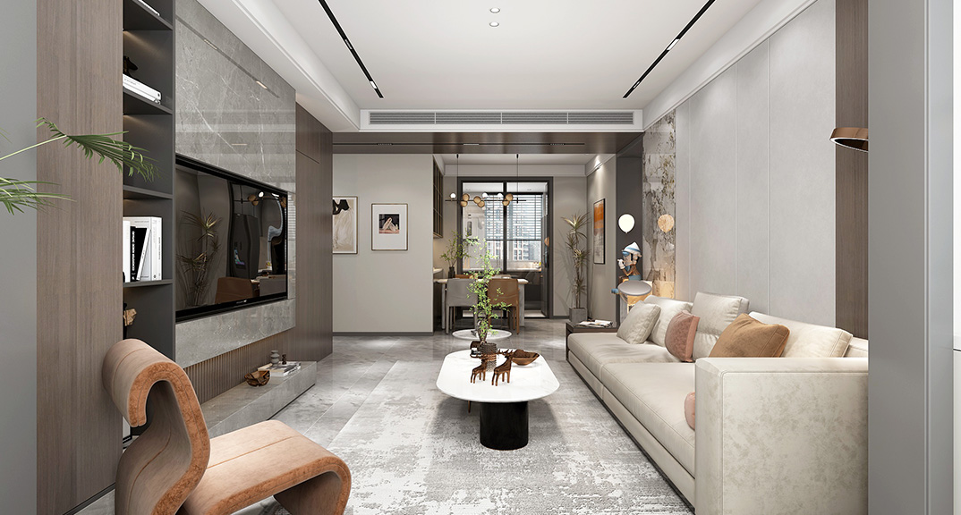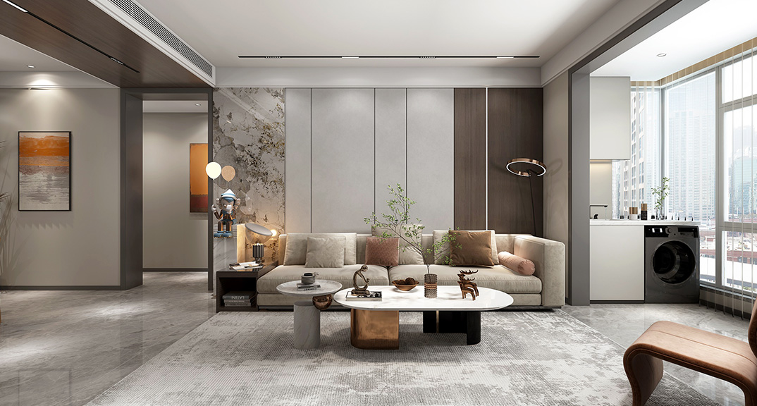 本案設(shè)計(jì)風(fēng)格為意式輕奢,拒絕了濃烈的色彩,以一種簡(jiǎn)單、純粹的設(shè)計(jì)語(yǔ)言,回歸生活的本質(zhì),留存給居住者更多生活想象的空間。 整體空間灰橙色、駝色、與淺暖灰色調(diào)展現(xiàn)輕奢低調(diào)的高級(jí)質(zhì)感,簡(jiǎn)約時(shí)尚的家具又增添了一份現(xiàn)代感,重新梳理了空間功能和尺寸,客廳陽(yáng)臺(tái)一體化設(shè)計(jì),最大限度引入自然光,高級(jí)灰搭配中性色系木飾面,打造一個(gè)舒適的高品質(zhì)空間。在空間設(shè)計(jì)與色彩配搭上,精準(zhǔn)地把控節(jié)奏,用設(shè)計(jì)表達(dá)空間的包容性,更多的是通過(guò)人性化思考,創(chuàng)造一個(gè)功能性完整的舒適生活空間。大塊的木飾面、金屬元素和燈 光的碰撞搭配,凸顯出強(qiáng)大張力,共同打造出意式輕奢腔調(diào)十足的時(shí)尚與質(zhì)感。