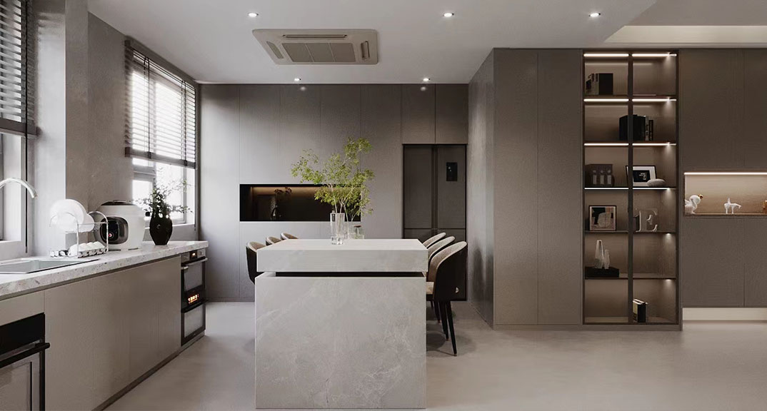 以簡潔、清晰和功能性為特征的室內(nèi)設(shè)計;它主要強調(diào)了空間的簡化和精煉,追求線條簡單、空間通透、色彩明亮、材質(zhì)自然等特點,注重形式與功能的結(jié)合。他們希望有一個時尚、現(xiàn)代的功能性空間,在整個空間的設(shè)計上用了暖灰調(diào)來與簡約的線條感來相呼應,能改造出一個通透、流暢的空間感。