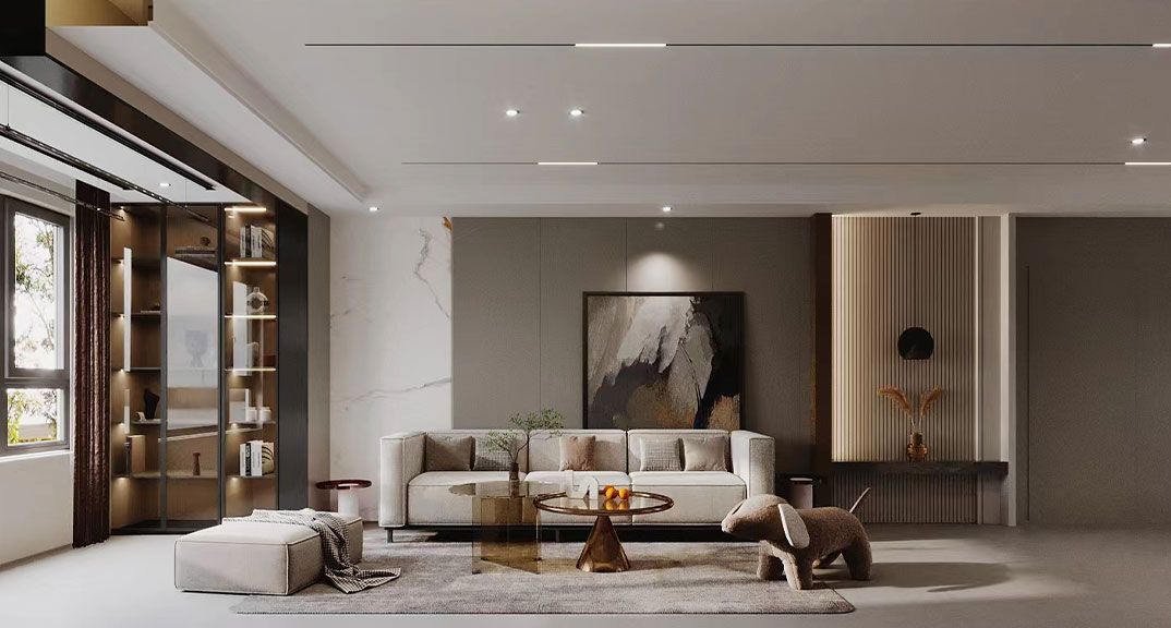 本案設(shè)計風格為意式輕奢,拒絕了濃烈的色彩,以一種簡單、純粹的設(shè)計語言,回歸生活的本質(zhì),留存給居住者更多生活想象的空間。 整體空間灰橙色、駝色、與淺暖灰色調(diào)展現(xiàn)輕奢低調(diào)的高級質(zhì)感,簡約時尚的家具又增添了一份現(xiàn)代感,重新梳理了空間功能和尺寸,客廳陽臺一體化設(shè)計,最大限度引入自然光,高級灰搭配中性色系木飾面,打造一個舒適的高品質(zhì)空間。在空間設(shè)計與色彩配搭上,精準地把控節(jié)奏,用設(shè)計表達空間的包容性,更多的是通過人性化思考,創(chuàng)造一個功能性完整的舒適生活空間。大塊的木飾面、金屬元素和燈 光的碰撞搭配,凸顯出強大張力,共同打造出意式輕奢腔調(diào)十足的時尚與質(zhì)感。
