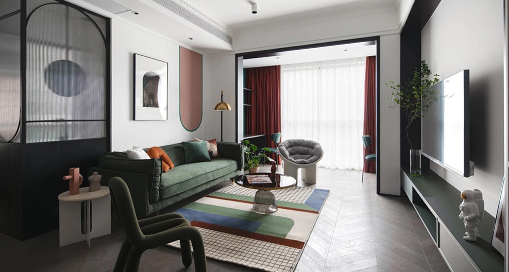客廳空間以白色為主色調(diào),融入墨綠、酒紅、臟粉等低飽和度彩色,為空間增添了繽紛、動感的視覺效果。沙發(fā)背景墻的掛畫與隔斷相呼應(yīng),采用相似的形狀,使整個背景墻整體有趣。主沙發(fā)右側(cè)輕盈有趣的bold chair與左側(cè)“憨厚”的大象椅相互制衡,平衡了大象椅的敦厚感。主臥整個空間大氣沉穩(wěn),顏色與結(jié)構(gòu)搭配合理。廚房水盆處用磨砂玻璃隔斷,增加整個空間的整體性,櫥柜以深色柜體白色臺面為主,整體干凈整潔,且呼應(yīng)家中氣氛。衛(wèi)生間由外往內(nèi)窺探,墻面延續(xù)了公共空間的綠色調(diào),采用碧綠色魚鱗磚拼貼而成,搭配上黑色邊框的長虹玻璃門和黃銅把手,清新復古的格調(diào)撲面而來