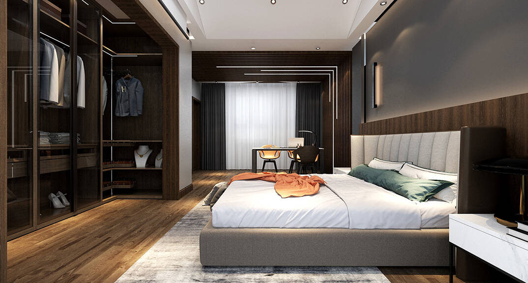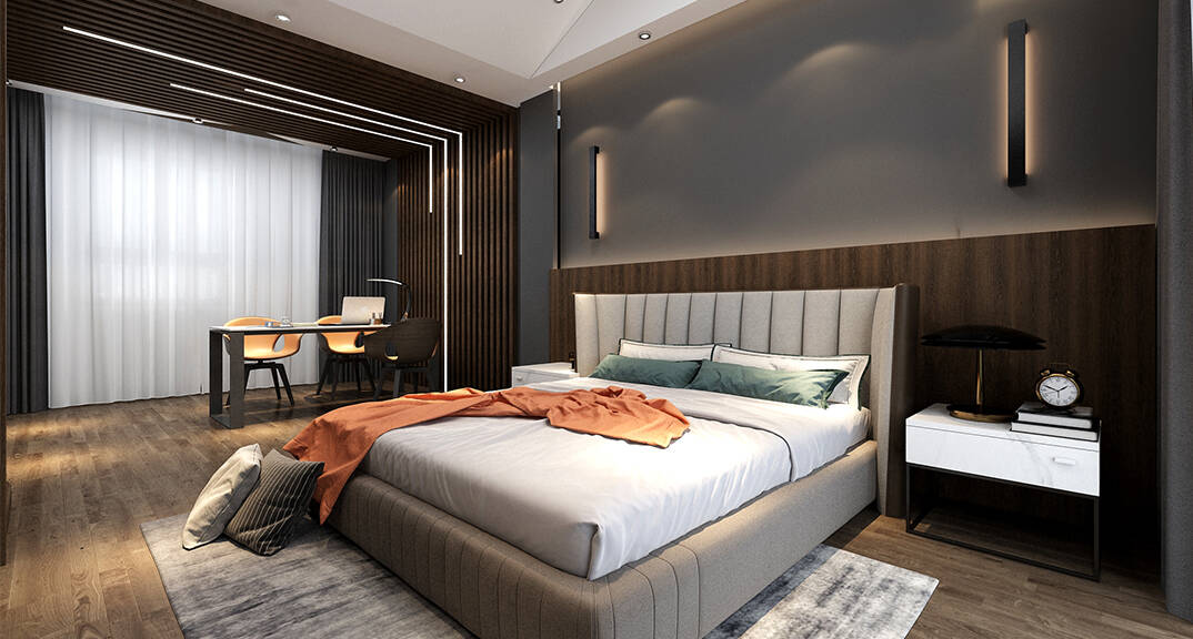 主臥套房的格調(diào)延續(xù)主設(shè)計(jì)調(diào)性,設(shè)計(jì)觀照點(diǎn)滴日常的豐富性,以高品質(zhì)的床具部品展呈生活的精致感,以造型別奇的燈飾搭建節(jié)奏韻律。根據(jù)高凈值人群對(duì)于私密空間日增的需求,除了衣帽間與主衛(wèi)的常規(guī)配套,空間升級(jí)配備了7㎡的書房。清甜茶香醒神舒心,助人在這隅沉浸式的精神之地中隨心享受。